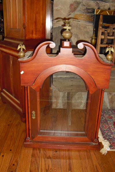 Ca. 1840. With folksy painted wood dial. Note: Stripped pine previously veneered. Front panel repaired.